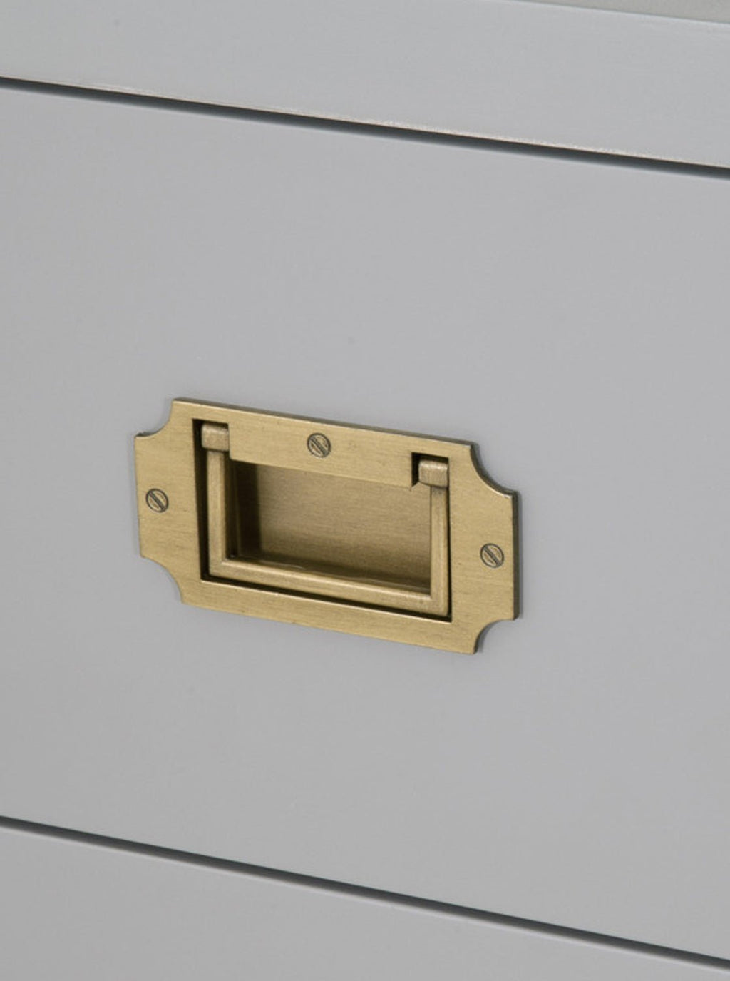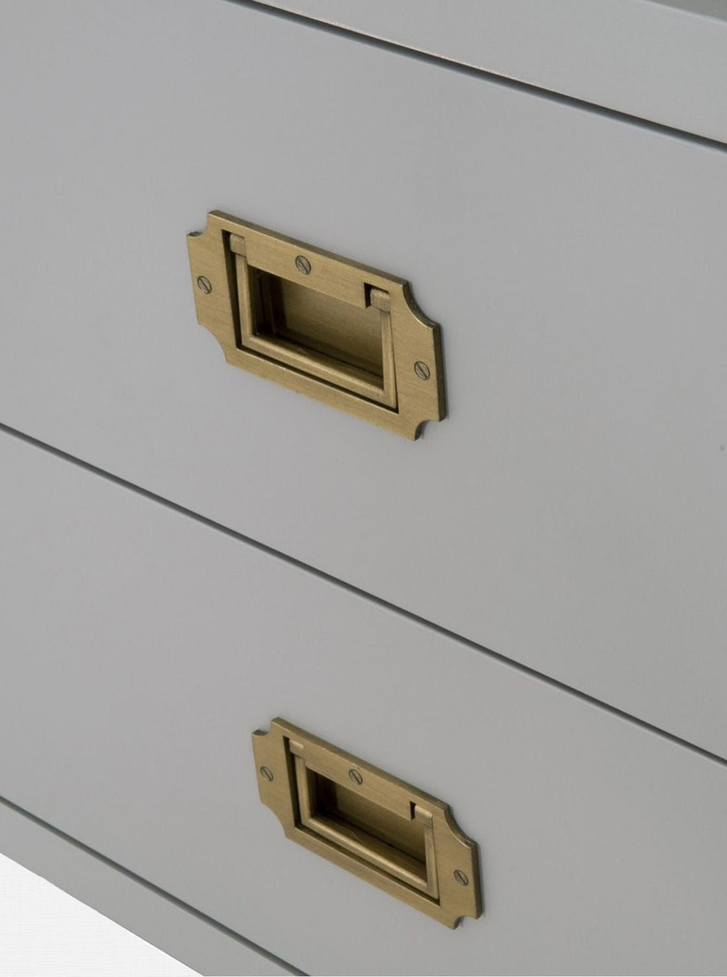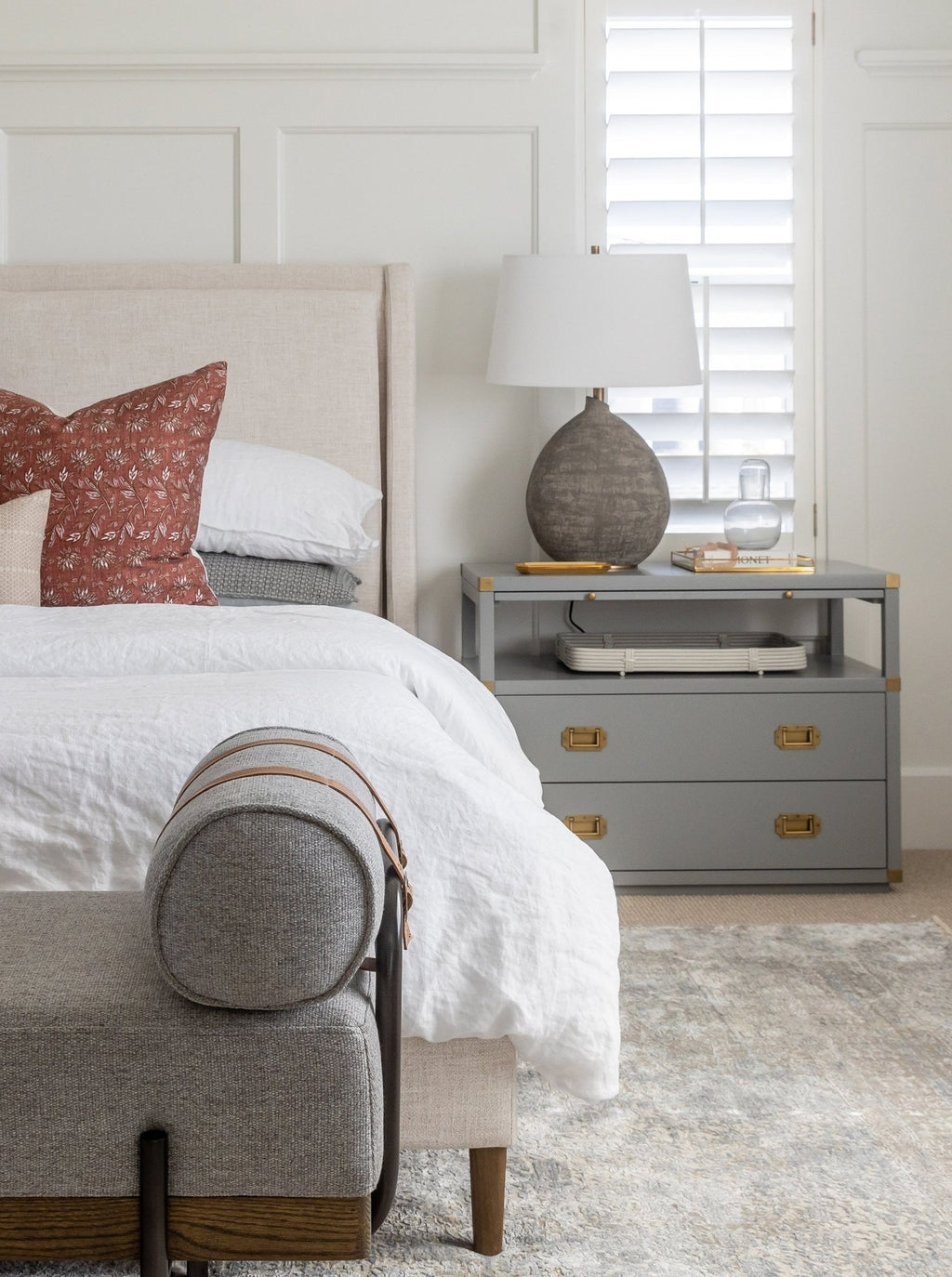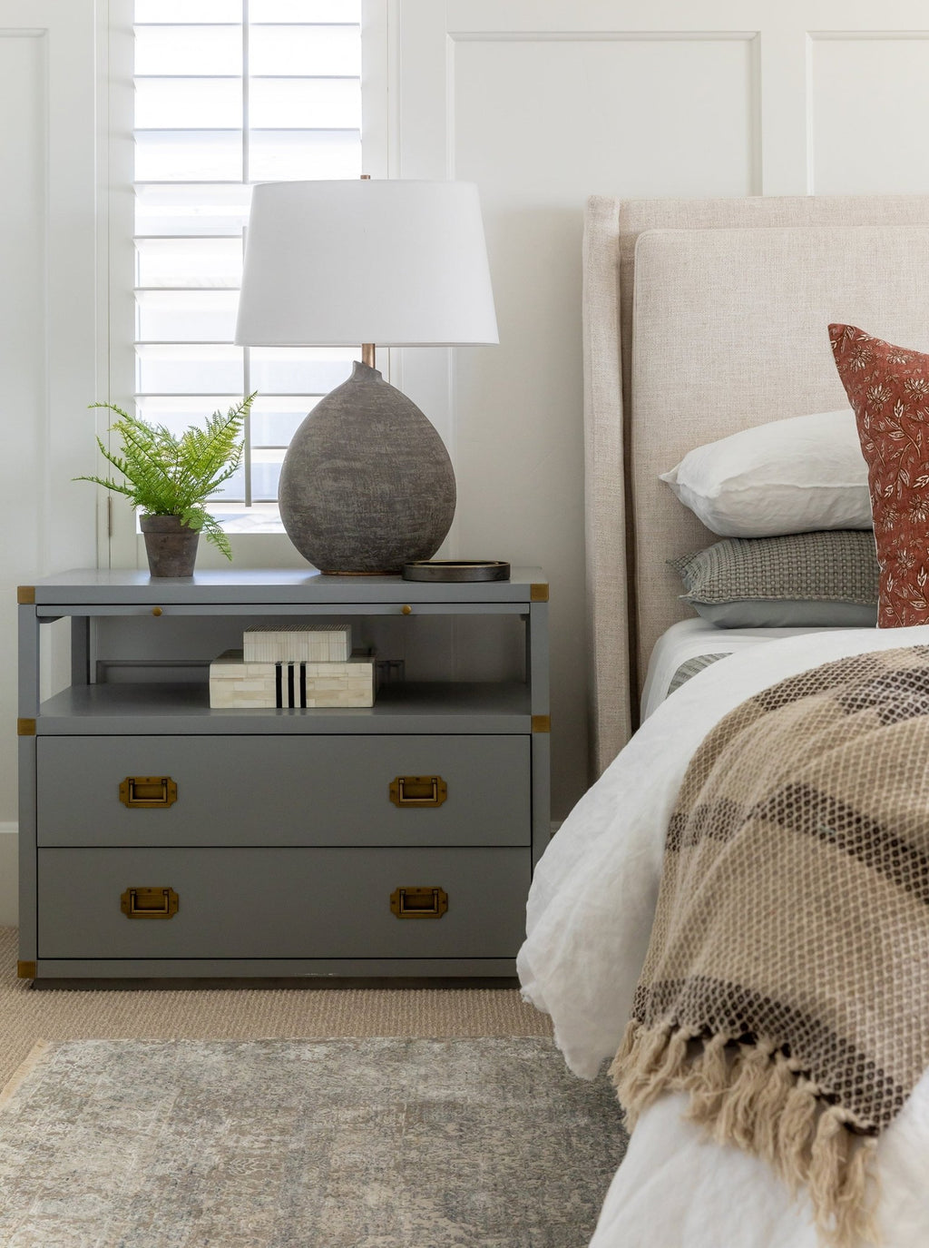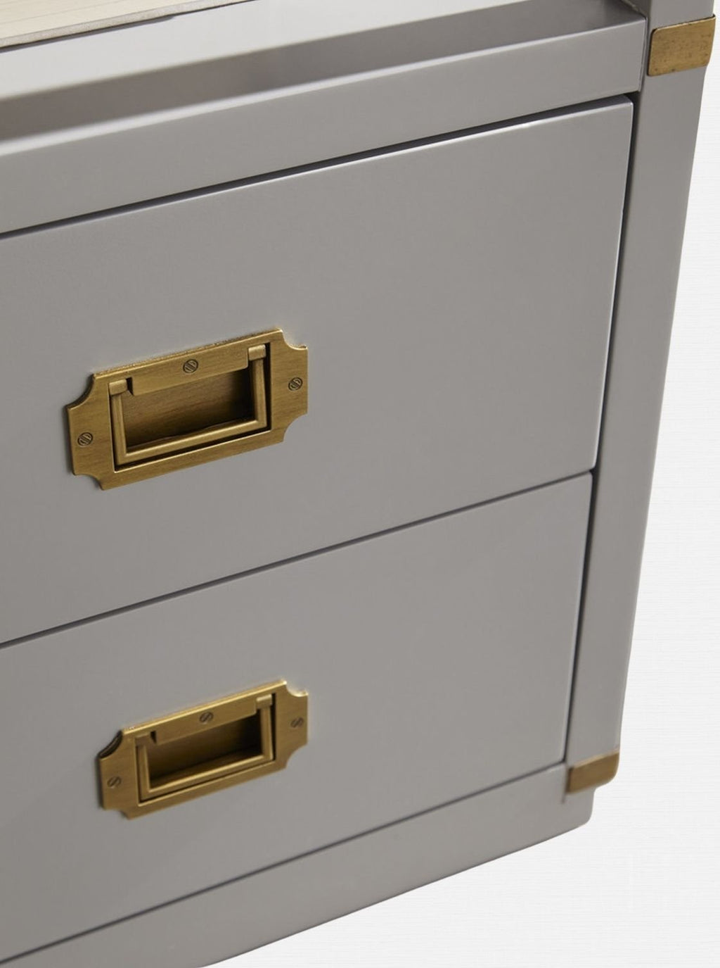 Sophistication meets functionality. With 2 storage drawers, a storage shelf and pull out tray, the Marie Nightstand has endless storage opportunities. Brushed gold pulls and braces add just the right amount of contrast to the soft dove gray finish.
