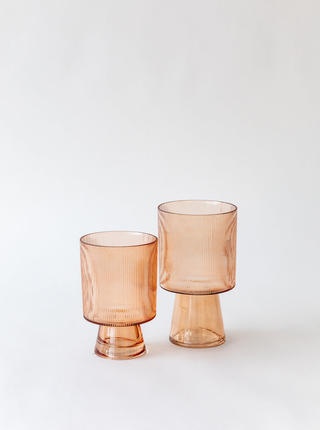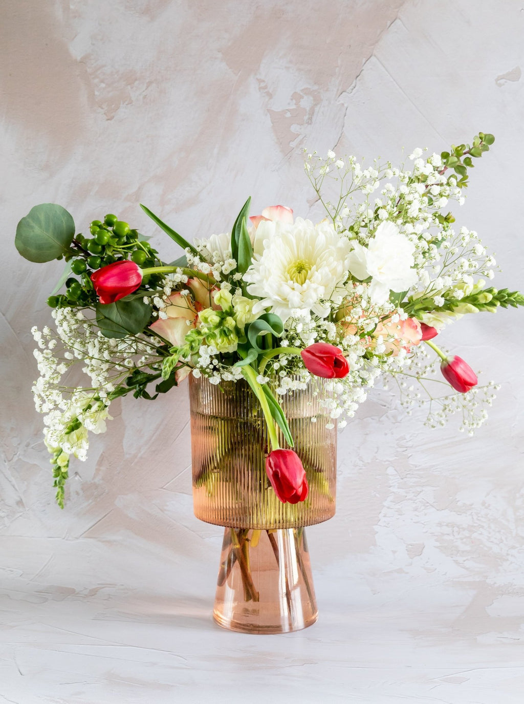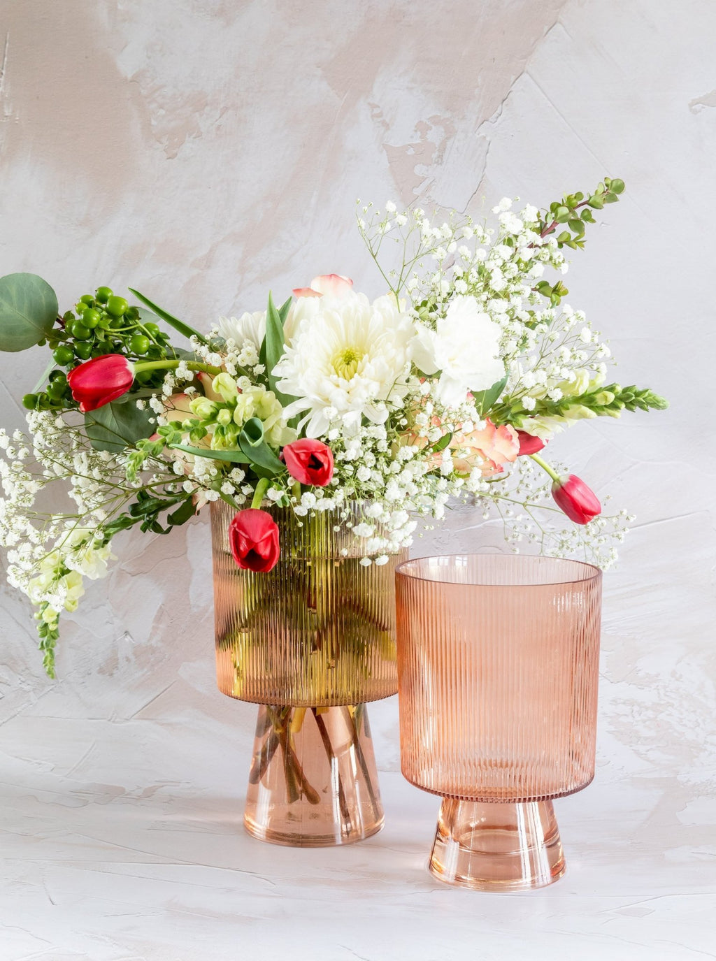The handmade glass Maude Vase is as timeless as it is versatile. Use it to hold your favorite florals or greenery, or display it on its own to highlight the blush rose finish & classic footed silhouette.